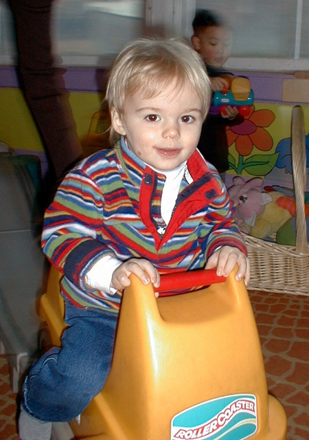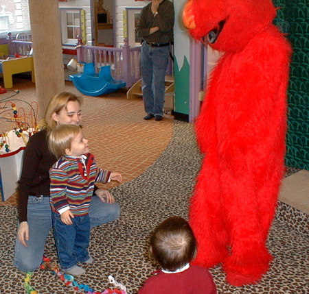 Playing with Elmo at a birthday party. Fun to look at but didn't like getting too close.