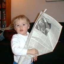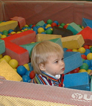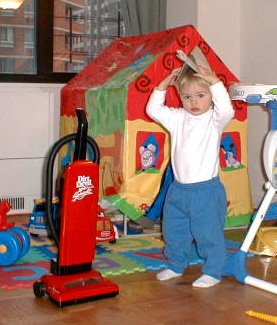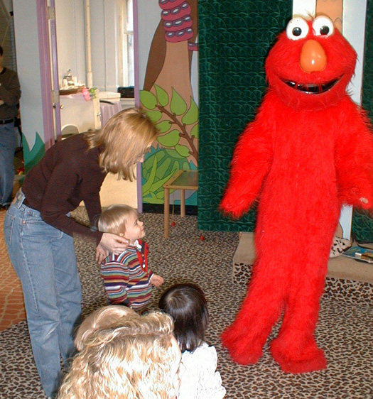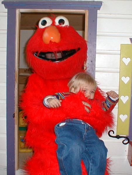 Playing with Elmo at a birthday party. Fun to look at but didn't like getting too close.