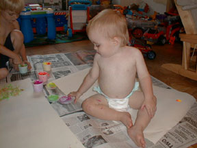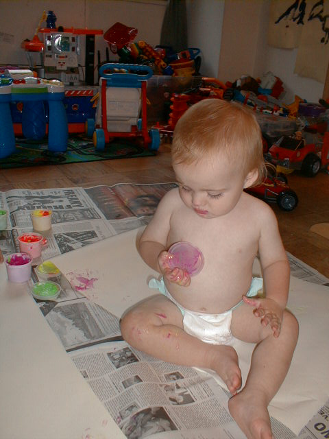 Having fun with paint. I think we got more on ourselves than on the paper.