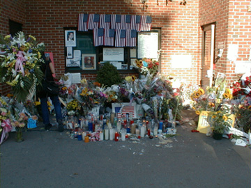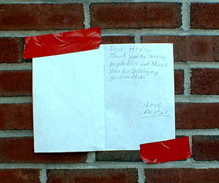On the wall of the firehouse to the left this note reads "Dear Heros - Thank you for saving peoples lives and thank you for saving my grandmother - Love Dexter" |